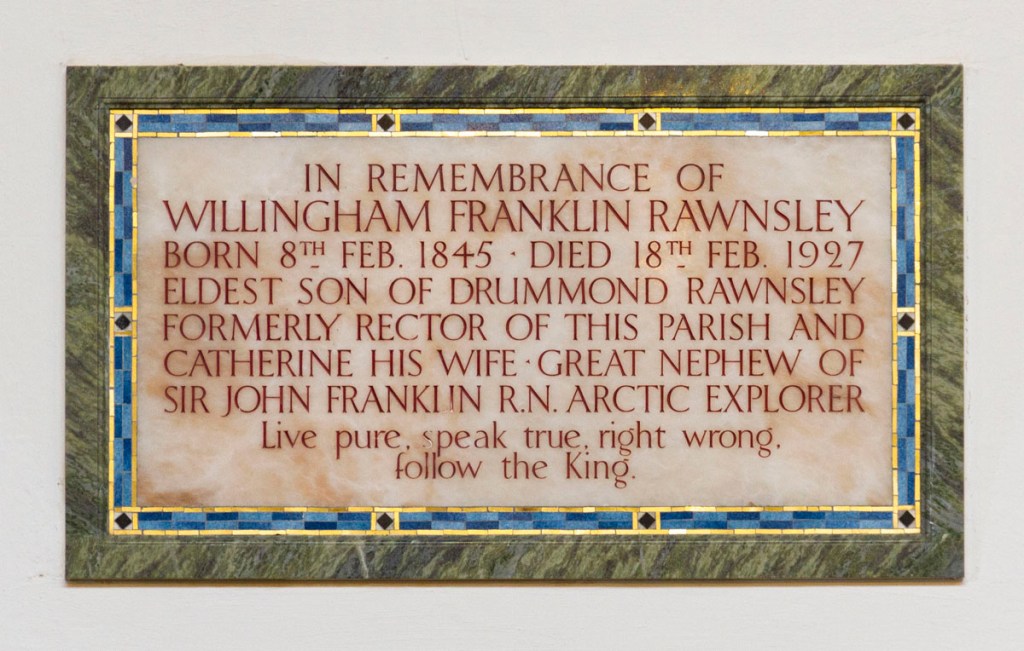 A tablet remembering former Rector Willingham Franklin Rawnsley who died in 1927, explains his connection as great nephew, to Sir John Franklin R.N. Arctic Expl