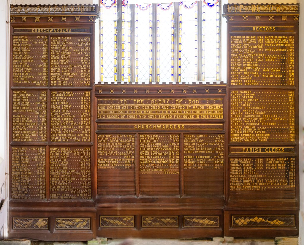 The board was dedicated at a service in 1911, guest preacher being Rev Canon Rawnsley – formerly the Rector at Halton Holegate, and included descendants of former Rectors Brackenbury, Rawnsley and Sale. The widow of the late Mr W.M. Cussons – who at that time held the record of 36 years as churchwarden – was also able to attend.