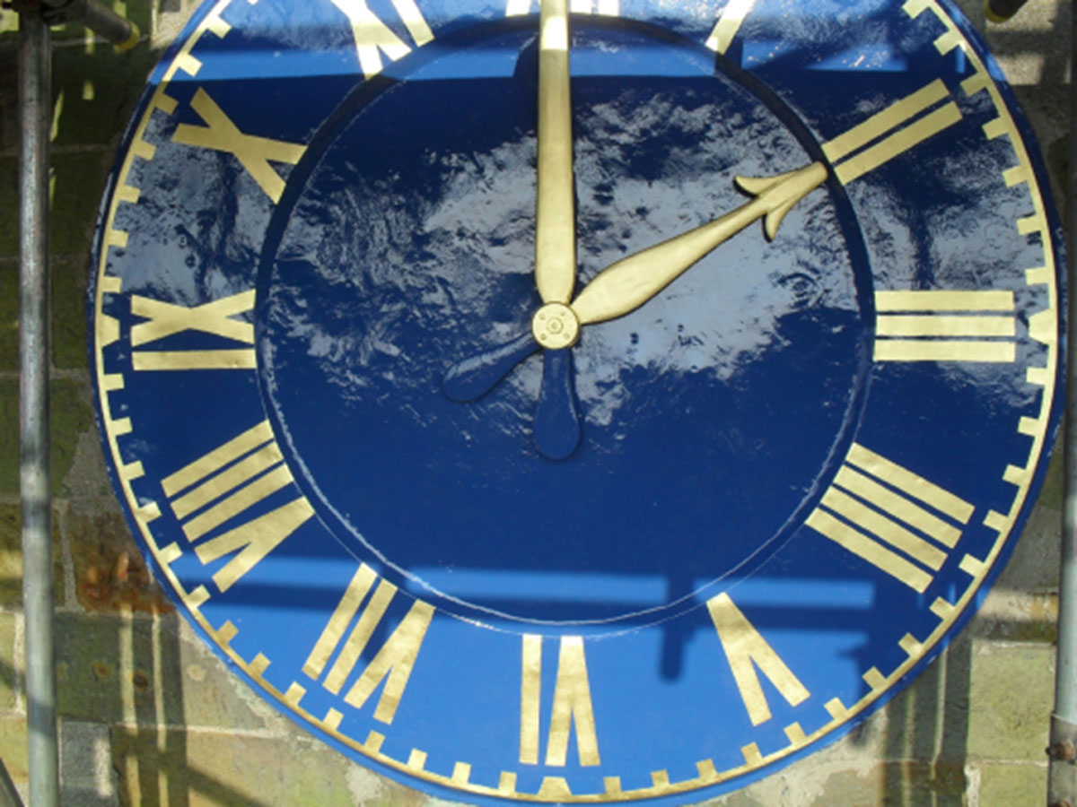 In keeping with the original colour scheme blue paint was applied to the face and hands, prior to the finishing of the hands, numerals, and minute markings with 23½ carat double thickness English gold leaf.
