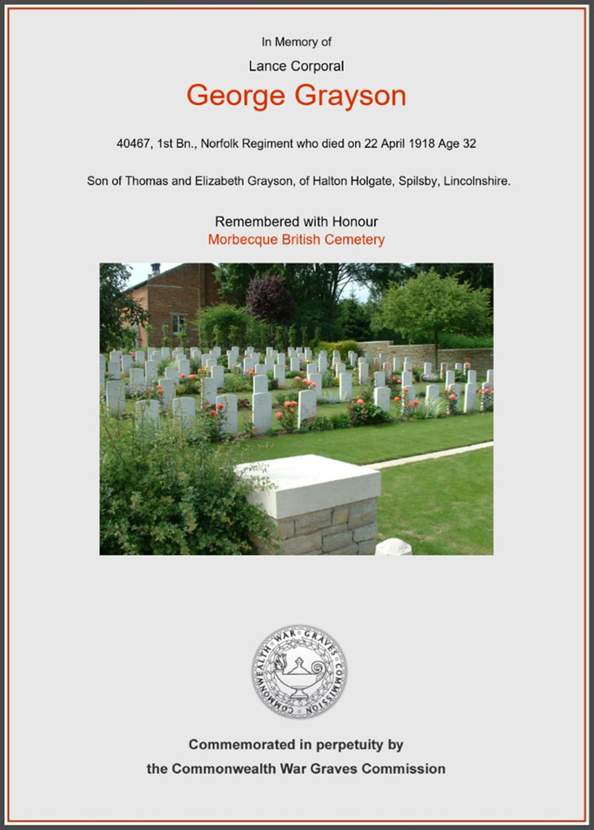 It was with great sorrow we heard of the death of George Grayson, son of Mr and Mrs Grayson, Fen Side. Not long ago he was home on leave and looked remarkably well. Soon after returning to France he was severely wounded, and a few days ago notice was sent to his aged parents to say that he had died in hospital. Mr and Mrs Grayson and family have the sympathy and good thoughts of all in the parish. Pray God help them to bear their burden.