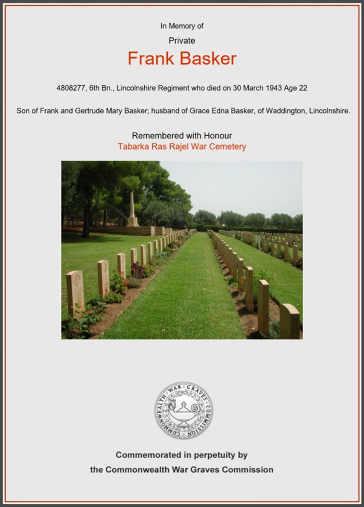Frank’s remains were *concentrated from Tamera (Tunisia) to Tabarka Ras Rajel British War Cemetery (Tunisia).