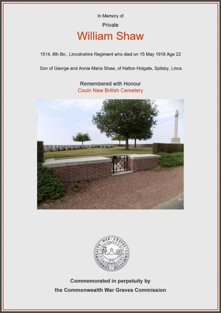 “It is with great sorrow we have to record the death, in France, of William Shaw age 22 years, son of Mr and Mrs G. Shaw, Northorpe Road. He was a boy of our day school, Sunday school (also a Sunday School teacher) and a member of the choir. He wrote a postcard home saying “I am quite well” but when the official news came, it was found that the next day after sending the above message he had passed away. When he joined the Army he was working as a gardener, near Grimsby where he was greatly respected. He is also remembered with affection at Mavis Enderby and Aswardby, where he worked for some time. We all send our heartfelt sympathy to his mother and father.”